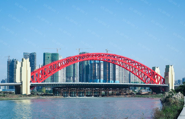 天保湾大桥主桥桥型采用中承式钢桁架拱桥,主跨230m,桥头堡采用高度抽象的竹笋造型,共5层,总高47m。是成都目前单跨跨径最大的桥梁。预计2019年8月竣工通车。