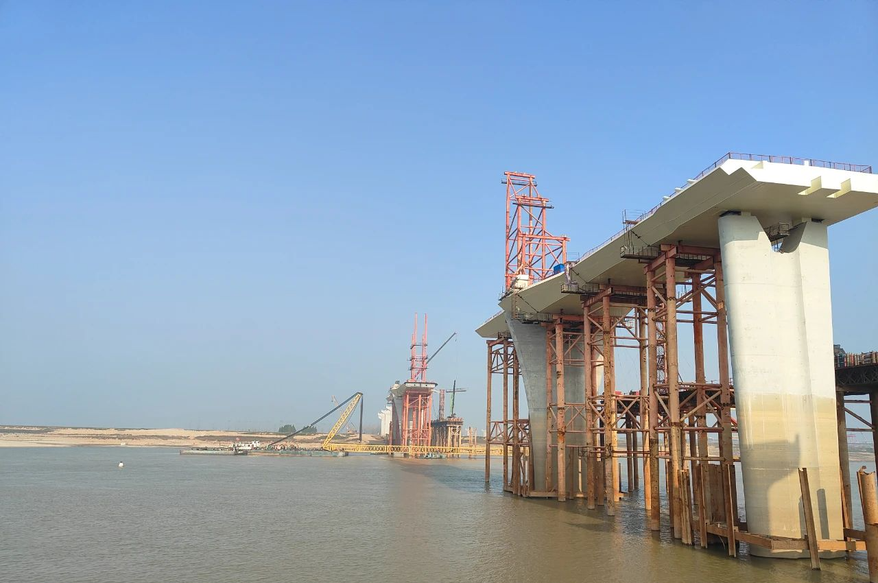 铁河大桥项目部正在全力推进主桥钢箱梁及钢塔架设。该项目边跨钢梁线型复杂,制造难度大,钢塔造型新颖,为八边形变截面结构。辉创重工克服困难,采用BIM技术进行三维建模分析,确保成桥线型美观。钢梁及钢塔采用船舶水运,现场600吨浮吊安装,有效的保证了铁河大桥现场吊装的进度、质量。