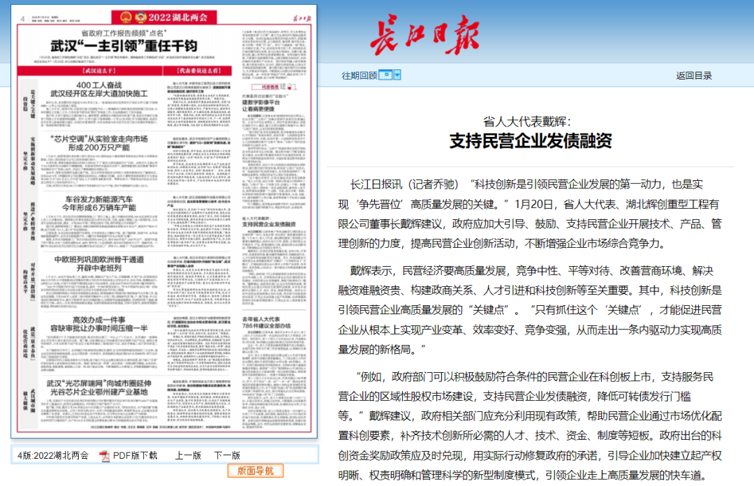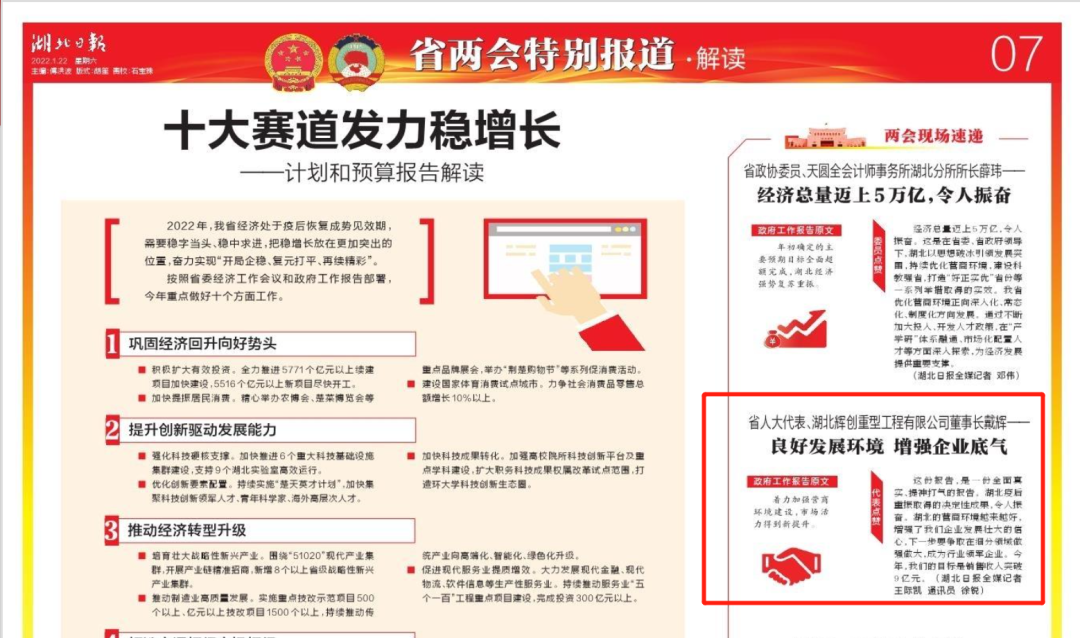 1月20日-23日,为期4天的湖北省十三届人大七次会议胜利召开。辉创重工董事长戴辉作为省人大代表,在会议期间多次受《长江日报》、《湖北日报》记者邀请,就“优质的营商环境将助力湖北省民营经济高质量发展”发表自己的观点。