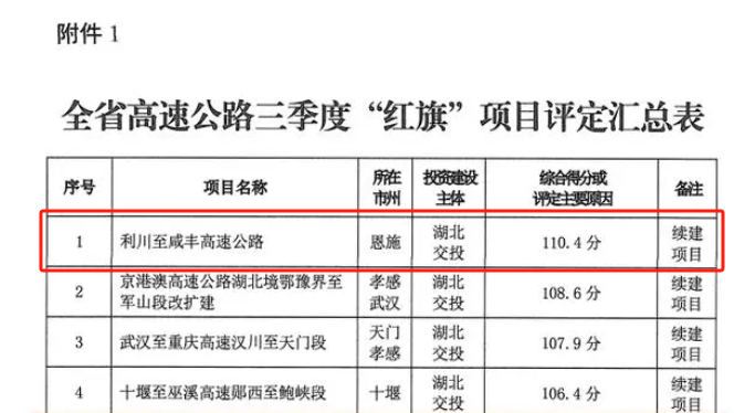 近日,湖北省交通运输厅发布了《关于全省高速公路推进情况及三季度“红旗”“蜗牛”项目评定情况的通报》,辉创重工承建的利咸高速公路项目连续三个季度获评省交通运输厅全省高速公路“红旗”项目,综合评分全省第一。